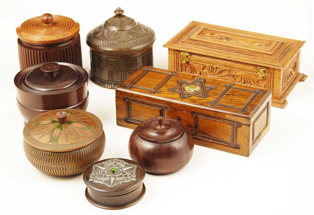An olive wood rectangular box, with applied star motif to the hinged cover, 9.25in (23.5cm) l, six turned treen boxes with covers and a carved Indian jewellery box. (8)