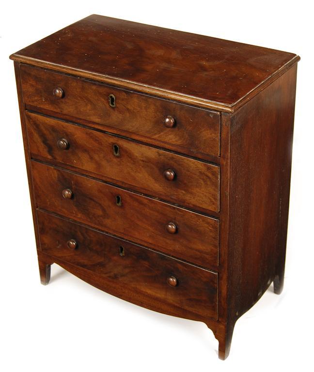 A Victorian mahogany miniature chest, the moulded edge rectangular top above four graduated drawers fitted turned knob handles on bracket feet, 14.25in (36.5cm) h, 12.5in (31.8cm) w, 7in (17.5cm) d. Probably an apprentice piece.