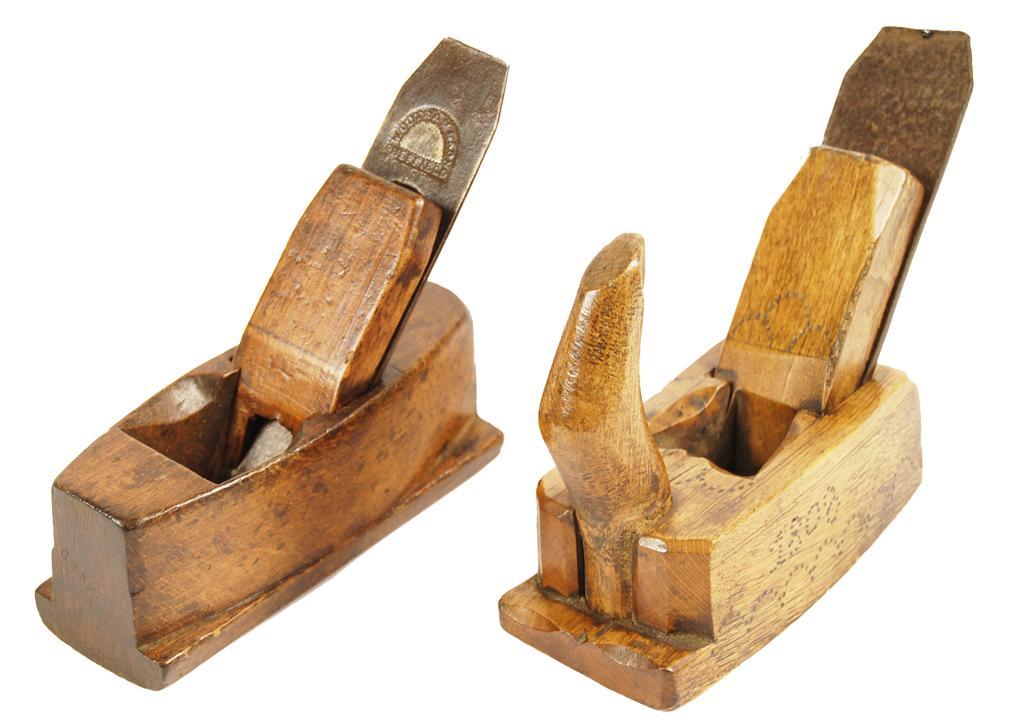 A treen moulding plane, with punched decoration and date '1808', with a steel blade, 4.75in (12cm) h, and another stamped 'G.H.SMITH', the cast steel blade stamped 'W.OUTRAM & SON, SHEFFIELD.' (2)