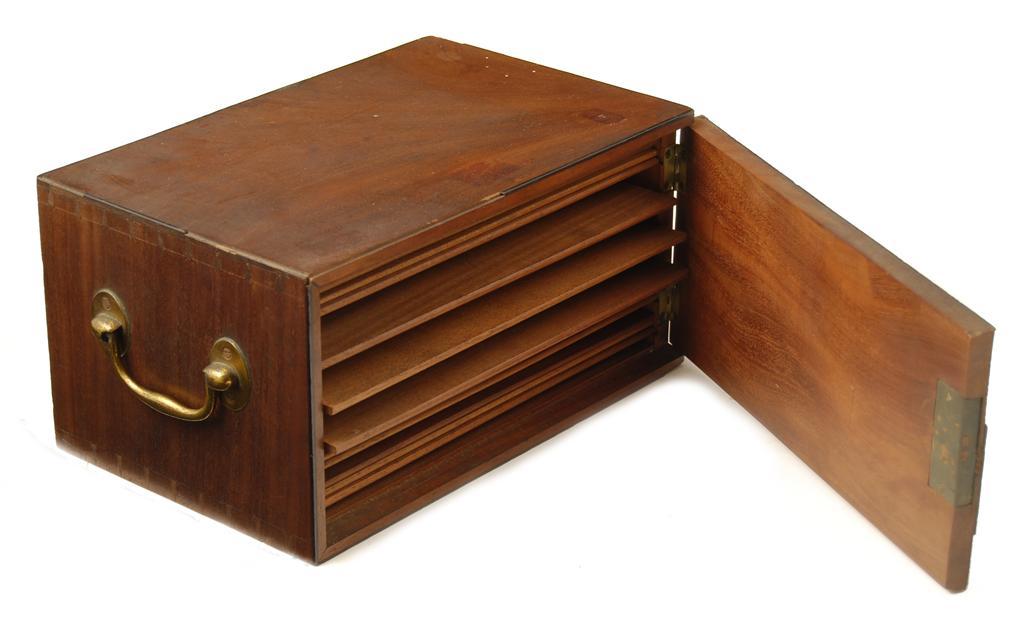 A late George III mahogany botanist's specimen chest, with ebony edging and gilt brass side handles, having a hinged door revealing six slides and six smaller press slides, 5.75in(14.5cm) h, 11in (28cm) w, 7in (18cm) d.