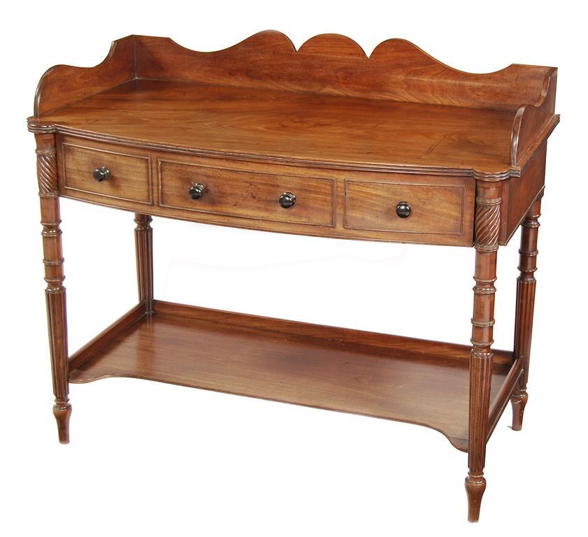 A Regency mahogany bowfront washstand in the manner of Gillows, the wavy edge three quarter gallery above a reeded edge top and three false frieze drawers, fitted turned ebony handles, on spiral reeded and turned ribbed tapering legs united by a galleried undertier, 36.75in (93.4cm) h, 43in (109.2cm) w, 24in (61cm) d. Old damages, replacements and restoration.