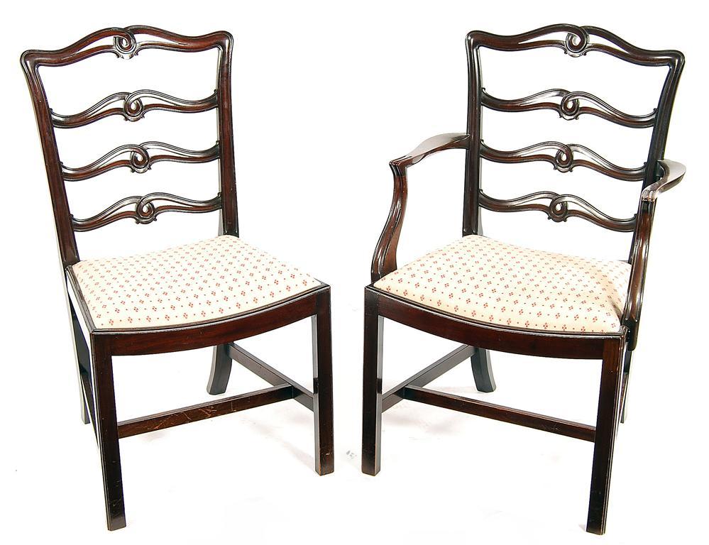 A set of eight mahogany dining chairs in George III style, with open and pierced ladder backs to drop-in dish seats, comprising: a pair of open armchairs and six side. (8)