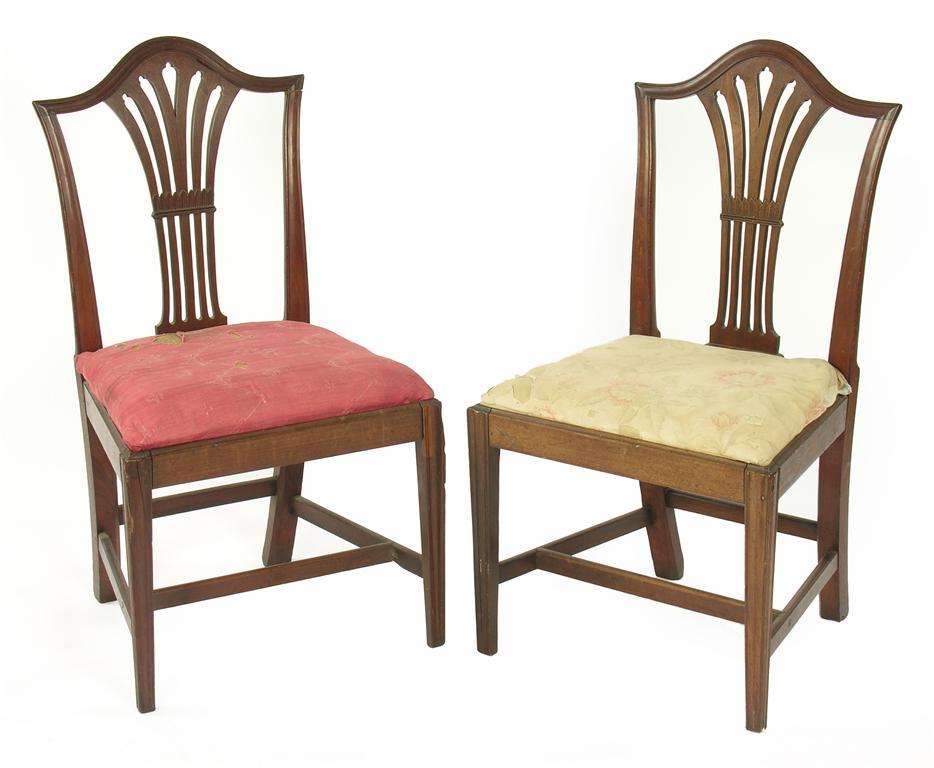 A set of four George III mahogany side chairs, the arched backs with pierced vase shape splats, having differing covered drop-in seats. (4)