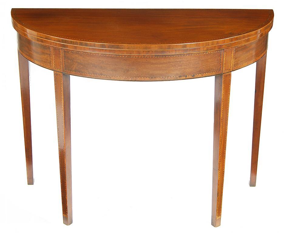 An early 19th century mahogany demi-lune tea table, inlaid stringing, the hinged top above a tulipwood crossbanded frieze on square tapering legs, 29in (73.5cm) h, 38.25in (97.4cm) w, 17.25in (43.8cm )d.