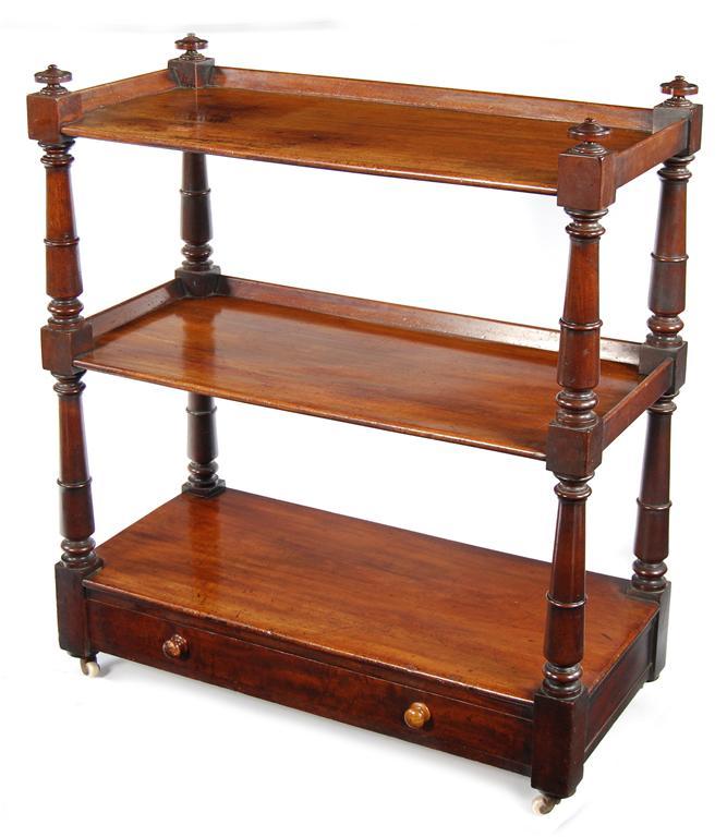 A Victorian mahogany three tier buffet, the base drawer with later turned knob handles, 41in (104cm) h, 36in (91.5cm) w, 17in (43.5cm) d.