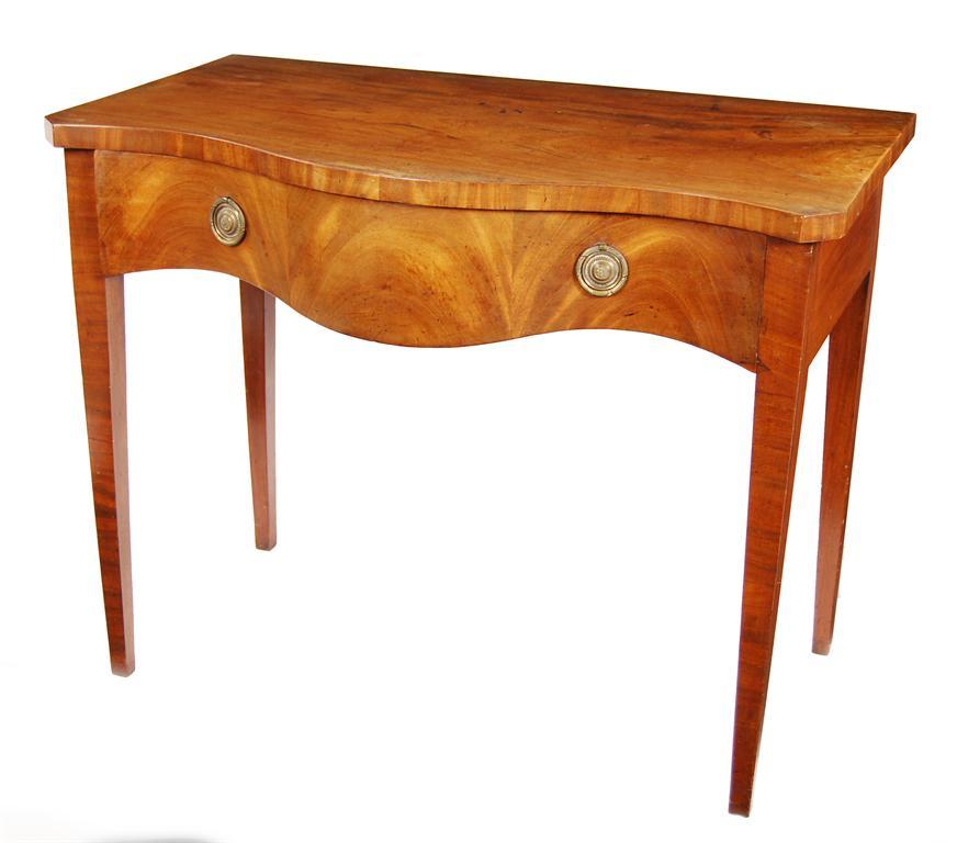 A late George III mahogany serpentine front side table, with a frieze drawer fitted replaced brass handles, on square tapering legs, 33in (84cm) h, 42.25in (107.2cm) w, 24.25in (61.6cm) d.