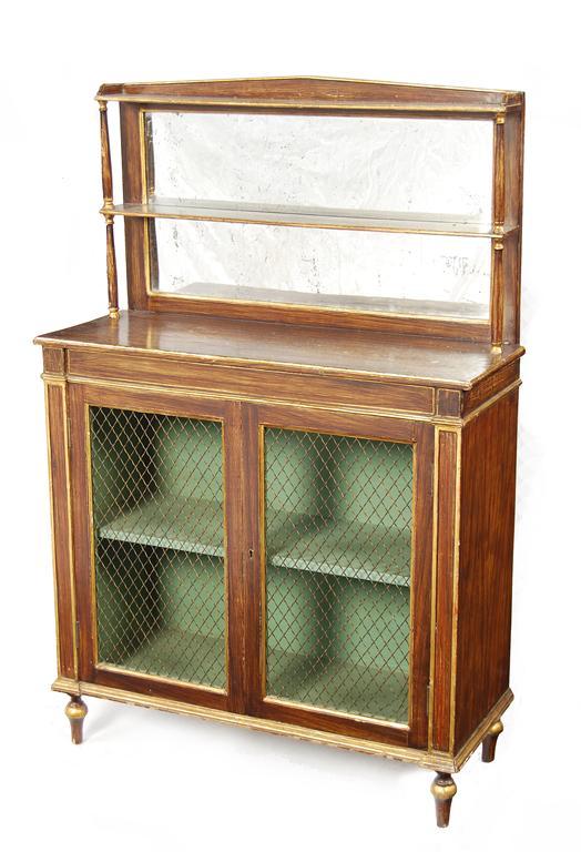 A 19th century simulated rosewood and parcel gilt chiffonier, the mirrored back supported by turned columns, the base with grille doors enclosing a shelf on turned feet, 48in (122cm) h, 31.5in (80cm) w, 12.25in (31.7cm) d.