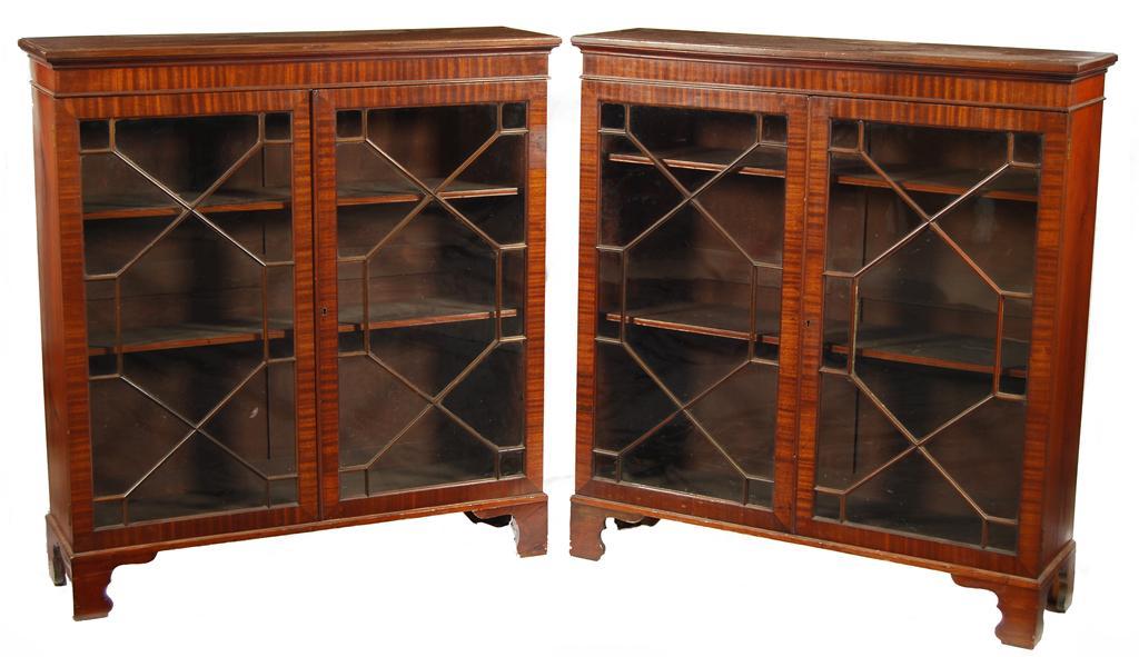 A pair of mahogany glazed cabinets, with adjustable shelves, early 20th century, 45.5in (115.5cm) h, 42.25in (107.5cm) w, 11.75in (29.5cm) d. (2)