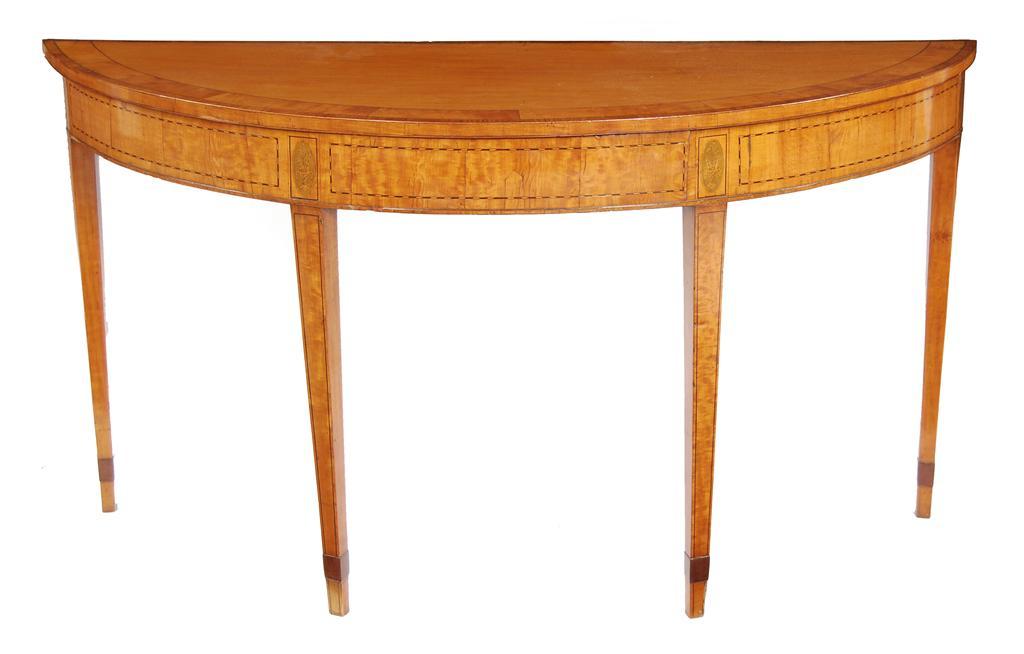 A George III satinwood console table, the demi-lune top with green stained stringing, a wide satinwood band and rosewood crossbanding, above a chequer line panel frieze flanking marquetry floral vases on square tapering legs with applied mahogany ankles, 30in (76.5cm) h, 57.25in (145cm) w, 20.5in (52cm) d.