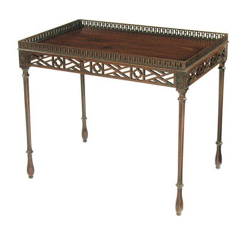 A George III mahogany silver table, the pierced and inlaid gallery above a fret work frieze on fluted supports headed by carved floral paterae on a matted ground, the base with an old label with inscription 'This table belongs to Kathy Foyle?', 28.5in (72.3cm) h, 33.25in (84.5cm) w, 22in (55.8cm) d. Old damages and restorations.