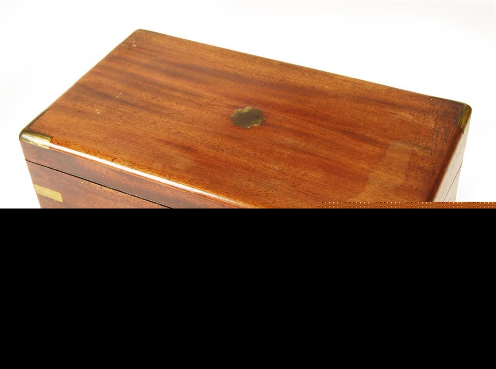 A Victorian mahogany and brass bound writing slope, with a gilt tooled leather lined interior, secret drawers, cover missing, and a side drawer, 6.75in (17cm) h, 17.75in (45cm) w. 4.5in. Crack to the top, lock missing.