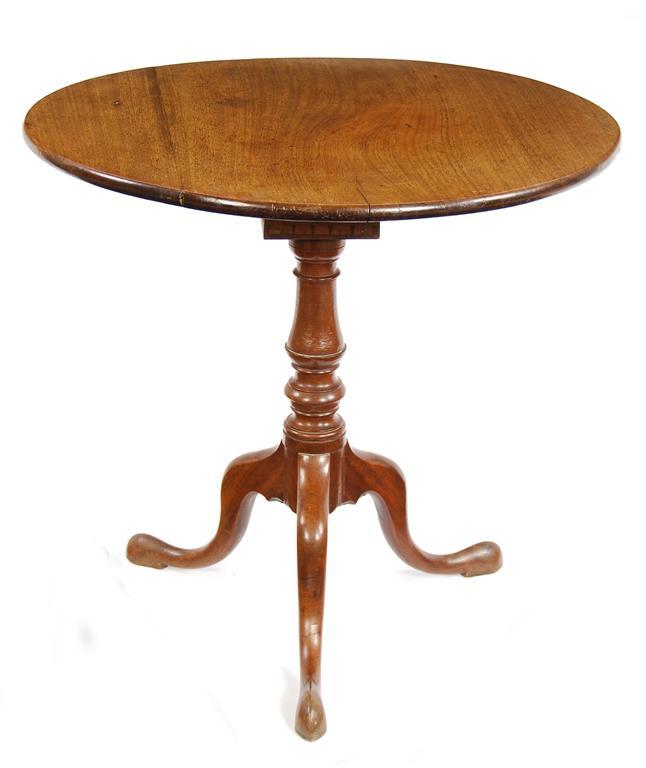 A George III mahogany tripod table, the circular tilt top revolving on a part enclosed bird cage with a baluster turned stem to scroll legs with faceted pointed pads, 29in (74cm) h, 30.5in (77.5cm) dia. Top repaired and with two cracks.