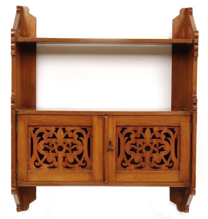 A Victorian mahogany hanging shelf, with a pair of pierced rectangular panel doors, 31.25in (79cm) h, 26.25in (66.5cm) w, 7.5in (19cm) d.
