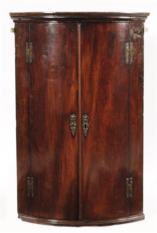 A George III mahogany bowfront hanging corner cupboard, with a pair of panel doors having gilt brass eagle mounted pierced escutcheons enclosing four shelves and two frieze drawers, 42.5in (108cm) h, 28.25in (72cm) w, 19.25in (49cm) d.