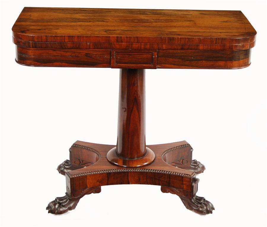 A George IV rosewood card table, the 'D' shaped hinged swivel top revealing a baize lined surface, a plain turned stem and a platform base with a nulled edge on scroll and paw feet to wooden castors, stamped 'F.C.F', 30in (76cm) h, 35.5in (90cm) w, 17.75in (45cm) d. Restoration, one foot moulding off.
