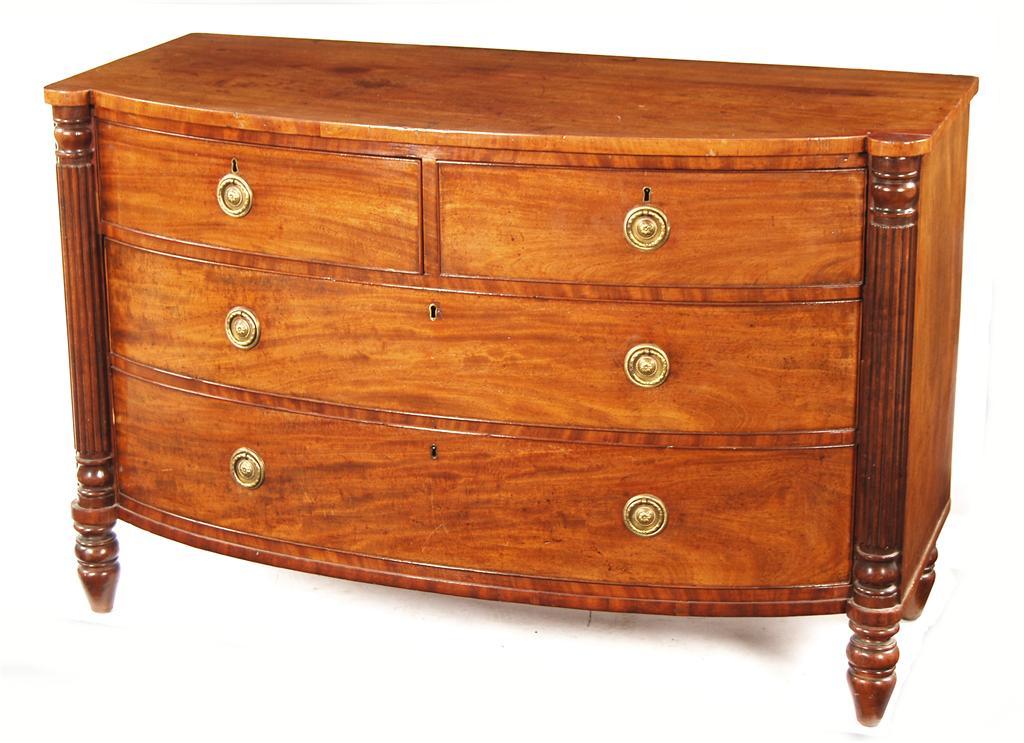 An early 19th century mahogany barrel front chest, with two short and two long graduated drawers, oak and cedar lined, fitted later circular brass plate handles, flanked by ribbed pilasters on turned feet, 32.25in (82cm) h, 50in (127cm) w, 23in (58.5cm) d. Old restoration.
