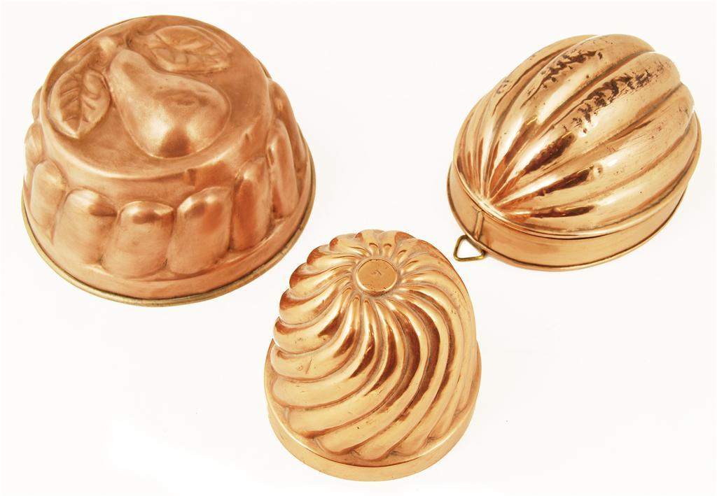 A Victorian copper jelly mould, of spiral ribbed form, 4in (10cm) h, another circular mould with a pear to the top and a ring fastener and a third in the form of a melon, with an oval base stamped '340 over 5', applied triangular fastener, 6.75in (17cm) l. (3)