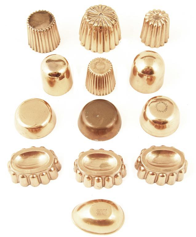 Two Victorian copper dariol moulds, of ribbed tapering form, stamped 'Jones Bros, Down St W,' 1.75in (4.5cm) and smaller, two similar moulds with wider ribs, three oval ribbed moulds with welled tops, stamped '173', and six plain moulds, one probably the base for an egg. (13)