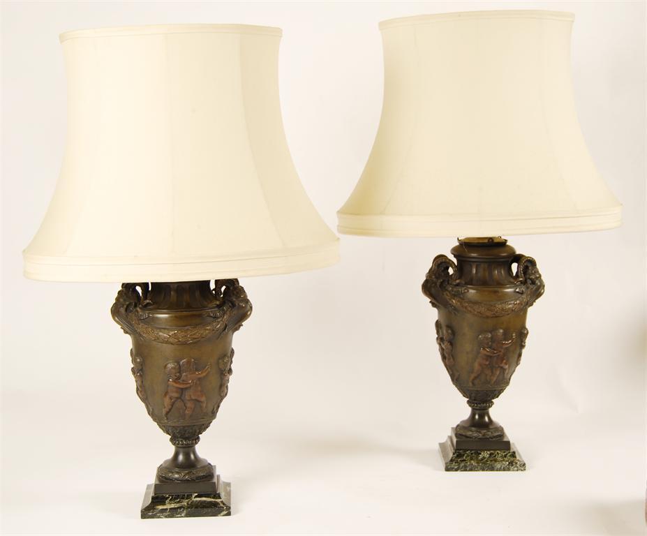 A pair of French bronzed table lamps, raised on green marble bases with stem vase bodies decorated a band of bacchanalian figures above mask lifts, with oval shades, 29.5in (75cm) h. (4)