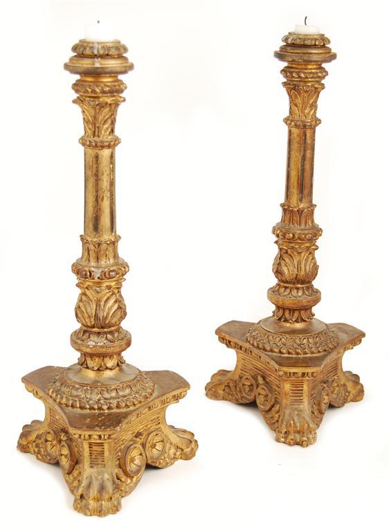 A pair of continental carved giltwood candlesticks, with loaded lead bases, 17.25in (44cm) h. (2)