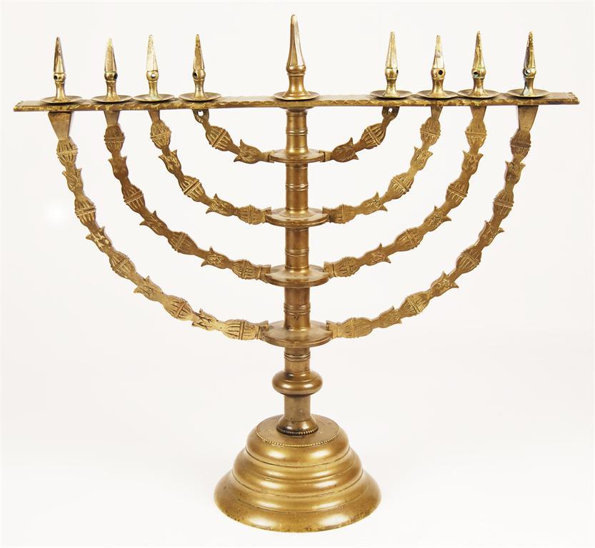 A brass menorah, with foliate branches to a ring turned column and a beaded turned domed foot, possibly 18th century, 25.5in (56.8cm) h, 24in (61cm) w.