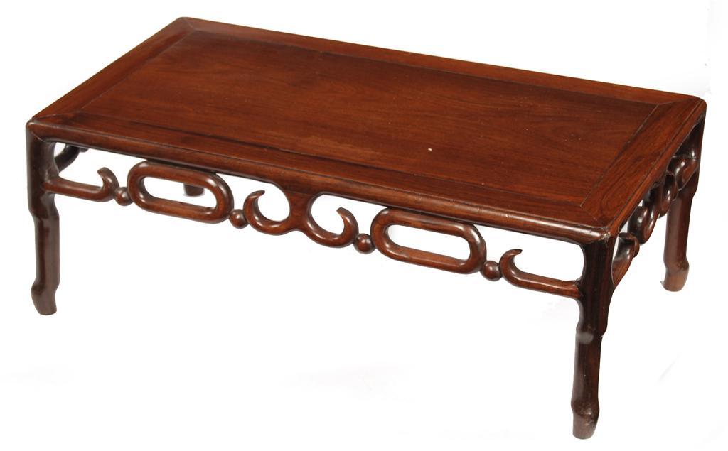 A Chinese hardwood low table, the rectangular cleated top above an open scroll and ball frame to conforming legs, 10.75in (27.5cm) h, 30in (76cm) w, 16.25in (41cm) d.