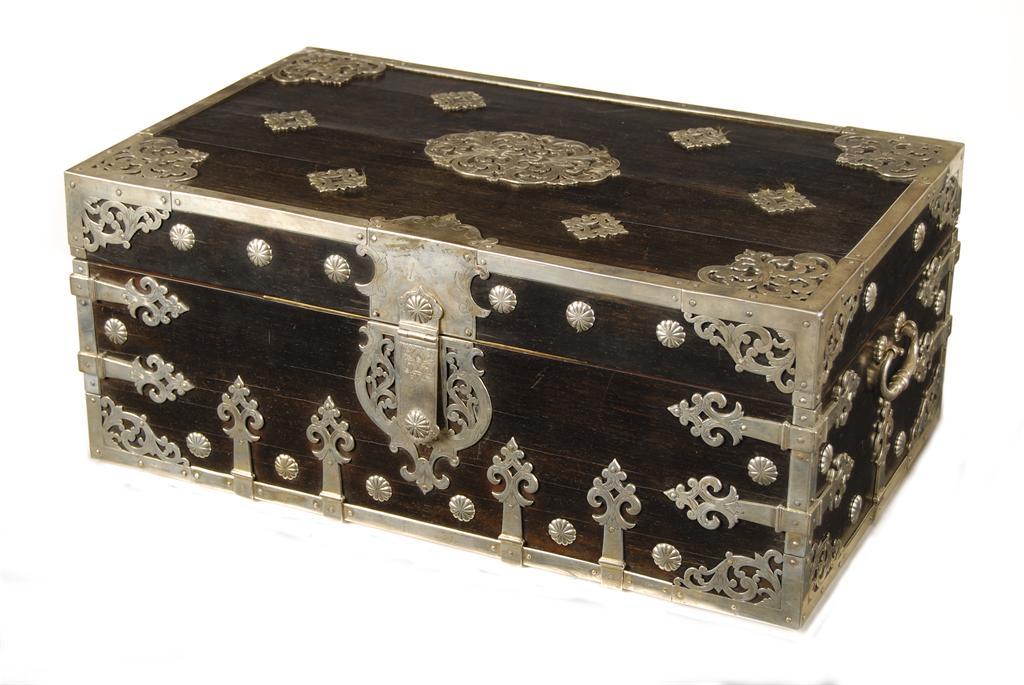 An 18th Dutch ebony and silver mounted box, with engraved and pierced foliate mounts and strapwork corners, the hinged lid revealing a compartmented interior, with a lift-out box with three hinged compartments, the sides with turned carrying handles, the lock clasp stamped with Dutch hall marks , 8in (20.1cm) h, 19.25in (48.8cm) w, 11.25in (28.5cm) d.