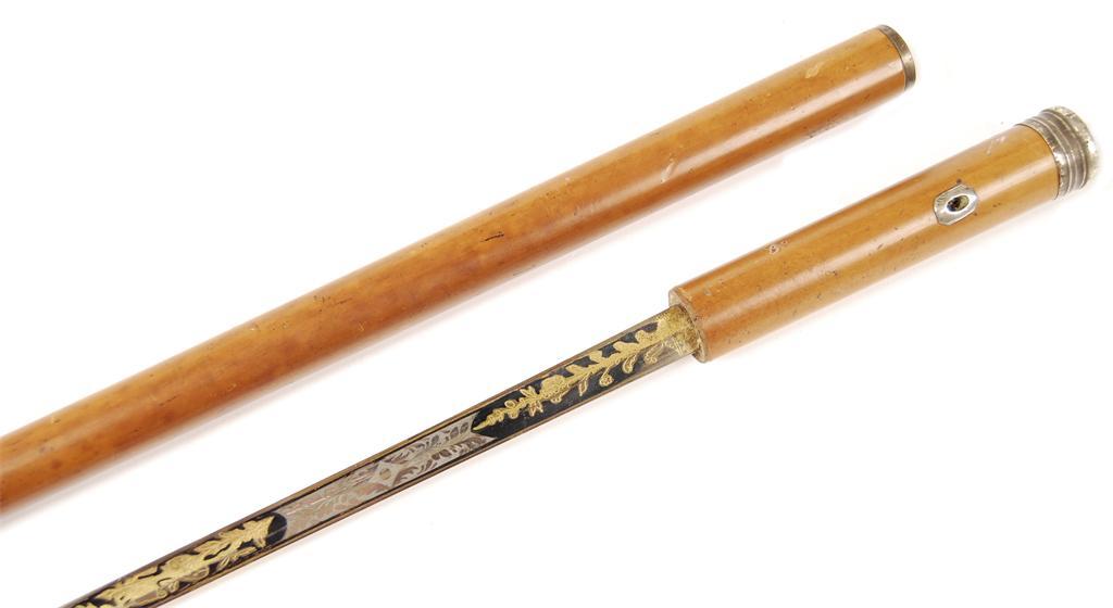 A malacca sword stick, the silver coloured metal handle engraved a mottoed gartered crest, with an engraved blued and gilt blade, 26.75in (68cm) l, blade, 34in (86.5cm) l.