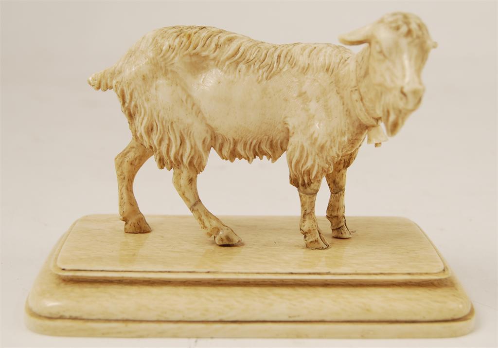 A 19th century carved model of a goat, standing on a stepped rectangular base, possibly German, 3.75in (9.5cm) h, 5.5in (14cm) w. All legs and one ear repaired.