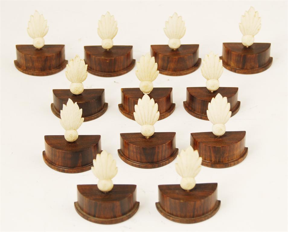 A set of twelve Anglo-Indian rosewood and ivory menu holders