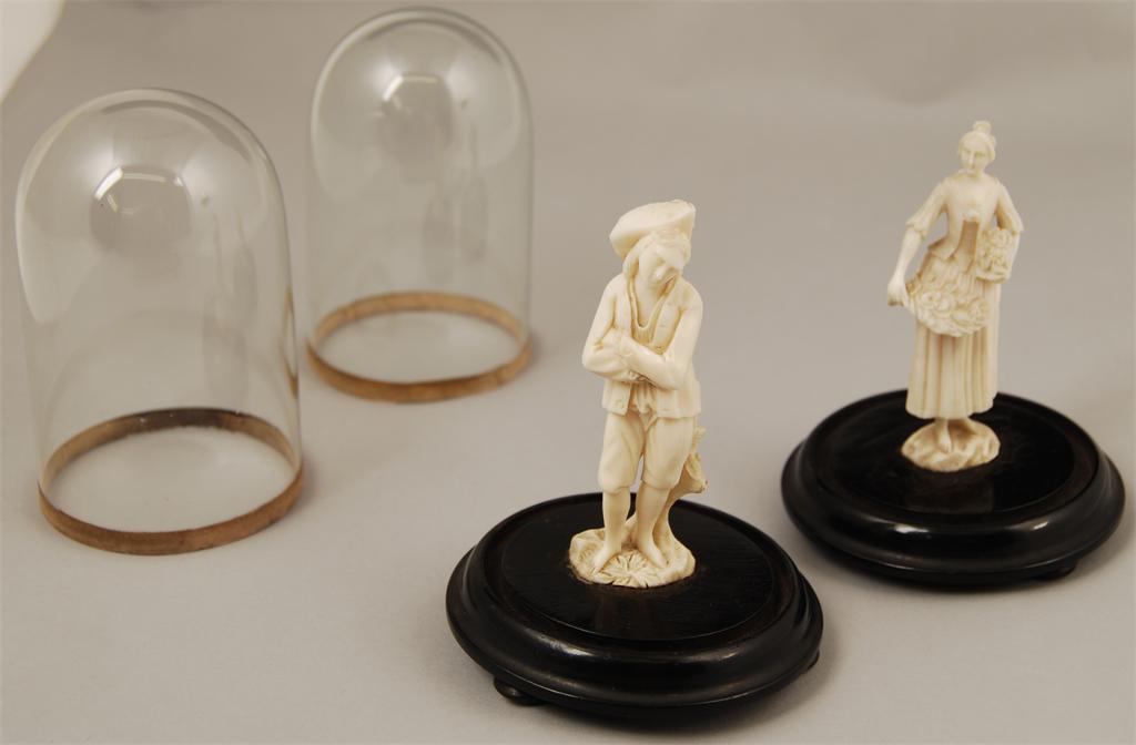 Two 19th century French carved ivory figures, of a lady flower seller and a gentleman wearing a tricorn hat, 3.25in (8cm) h, fixed to turned ebonised bases and under glass domes. (2)