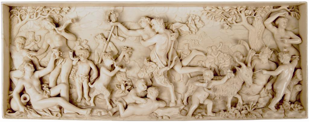 A 19th century German ivory plaque, carved in relief with fauns and maidens in Bacchanalian revelry, 3.75in (9.8cm) h, 10in (25.6cm) w.