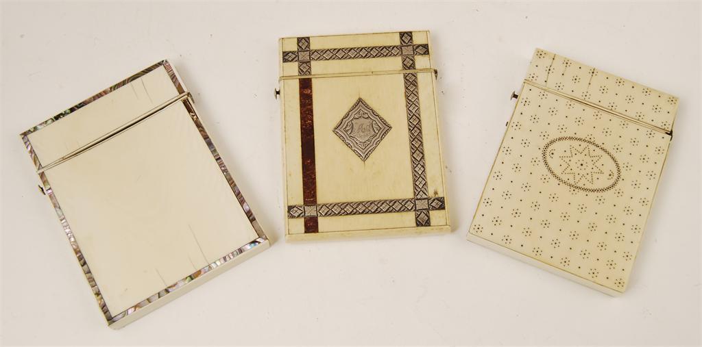 A Victorian ivory and pique work card case, having a star motif within oval and hinged cover, 4in (10cm) h, another ivory card case with inset silver coloured metal banding, part missing, and a third with abalone borders. (3)
