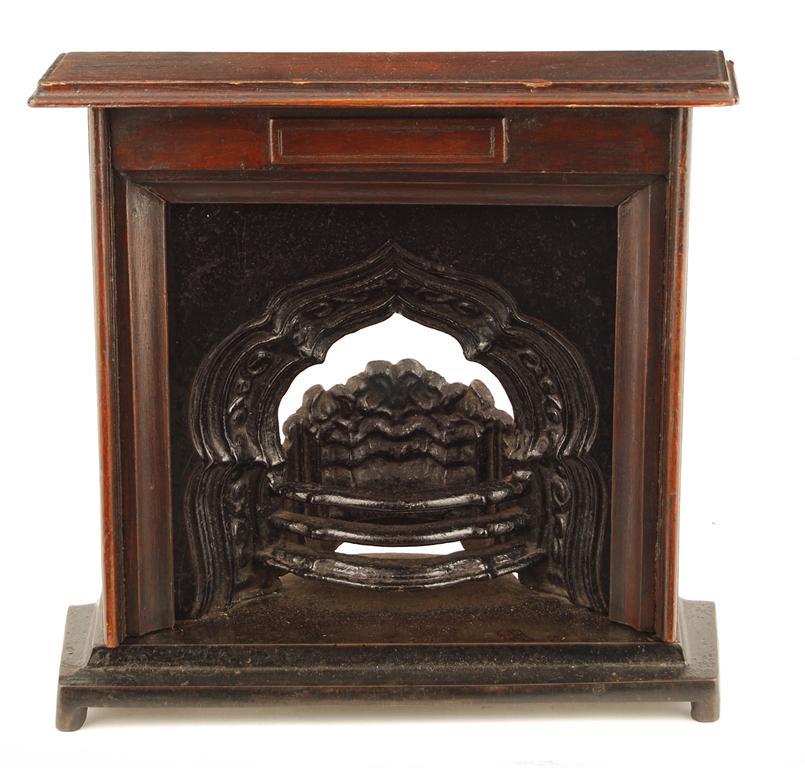 A Victorian cast iron miniature fireplace, with a mihrab design surround and a scroll fireback with a bar front, on a stepped bases, 9.75in (25cm) h, 12in (30.5cm) w, with a later mahogany surround.