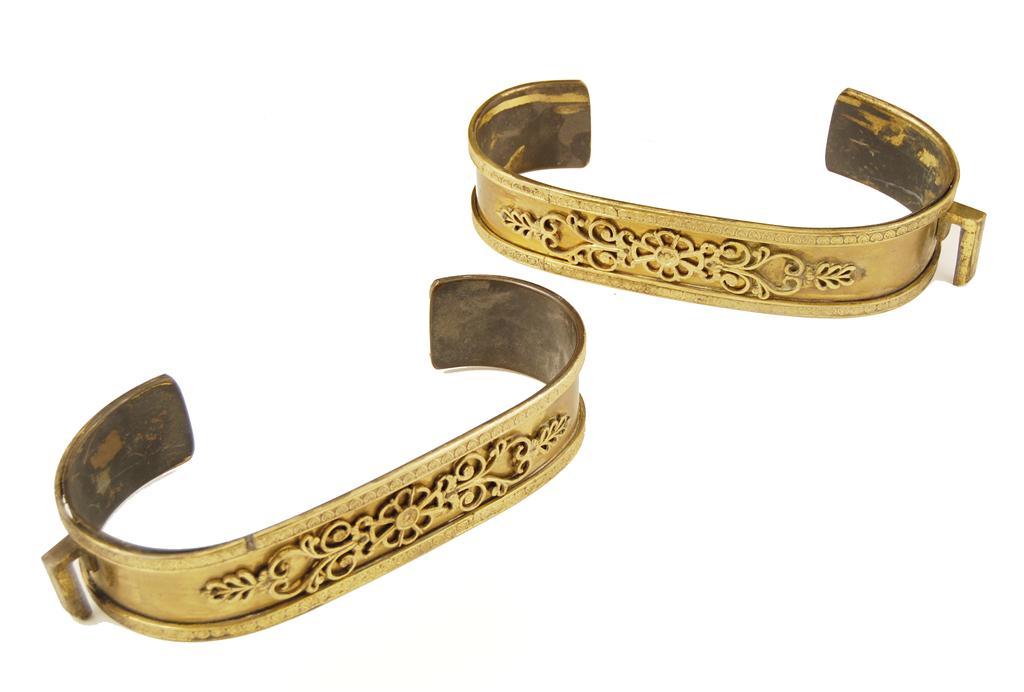 A pair of early 19th century brass tie backs, with stamped palmette borders and central pierced foliage appliques, each with a hook, 10in (25.4cm) w. (2)