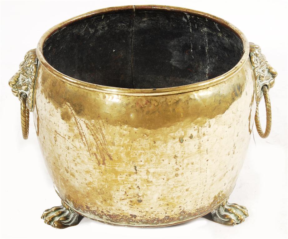 A Dutch brass jardiniere, with lion's mask ring handles and paw feet, 12.25in (31.1cm) h, 19.5in (49.5cm) w.