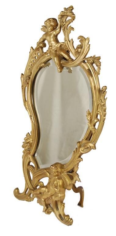 A cast gilt brass easel back mirror, the shaped bevelled plate within a scrolling foliage frame with two putti, 16.25in (41cm) h, 9.5in (24cm) w.