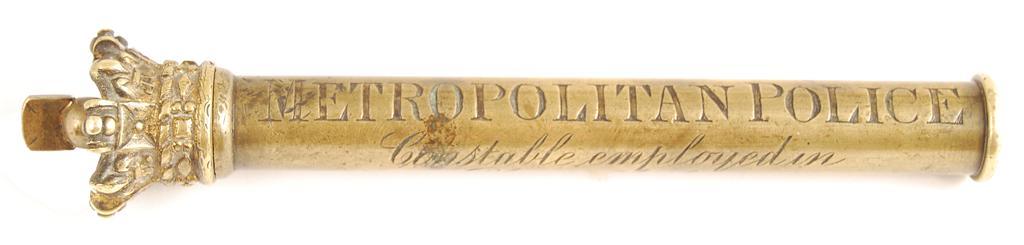 A late Victorian brass Tipstaff, with screw off crown cover, the tubular body inscribed 'METROPOLITAN POLICE Constable employed in Plain Clothes,' and stamped 'PARKER FIELD & SONS 233 HOLBORN LONDON,' 7.25in (18.5cm) l. Tipstaves were carried by law enforcement officers and would hold warrants of arrest. The present example dates to post 1870, when they were re-issued with inscription. They were withdrawn in 1887.