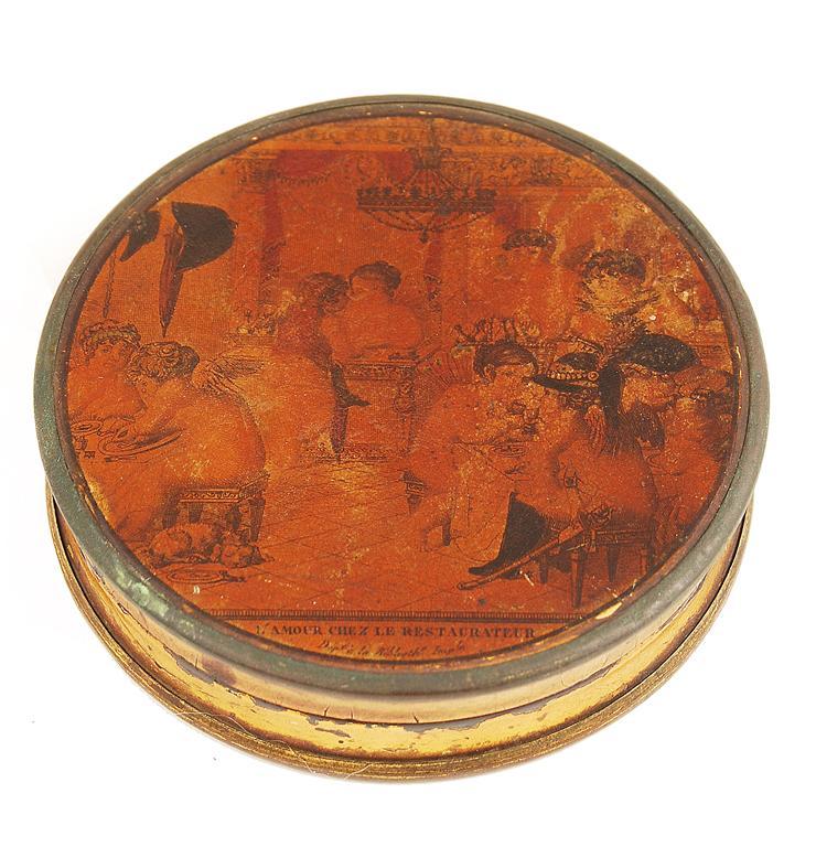 A 19th century French papier-mache snuff box, gilt decorated, the cover with a print titled 'L'Amour Chez le Restaurateur', 3.5in (9cm) dia.