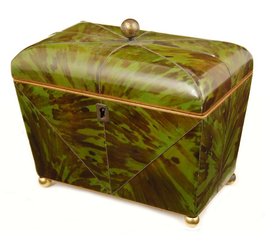 A Regency green tortoiseshell tea caddy, of tapering sarcophagus form with pewter stringing and boxwood edging, the hinged cover with a brass ball finial revealing a red velvet lining and twin lidded compartments with turned ivory handles, foil lined, on gilt metal ball feet, 6.25in (16cm) h, 7.25in (18.5cm) w, 4.25in (11cm) d.