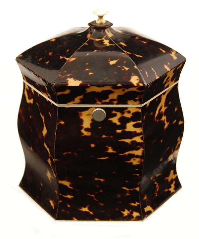 A Regency tortoiseshell octagonal tea caddy by Thomas Lund, of Pagoda form, the hinged cover with white metal stringing and a turned ivory finial, the front with a button catch to an ivory banded interior, the front edge stamped 'LUND, MAKER 57. CORNHILL. LONDON.', with a lidded compartment having a turned ivory handle, 5.25in (13cm) h, 4.75in (12cm) w. Thomas Lund was at 56 and 57 Cornhill, London from 1819 until 1840 as 'Manufacturer of Improved Letter Copying Machines for Counting Houses or Travelling, Portable Writing Desks, Dressing Cases, Pocket Books &c, &c,'. An almost identical caddy is illustrated in Marked London Furniture by Christopher Gilbert, 1996, p.309, pl.580.