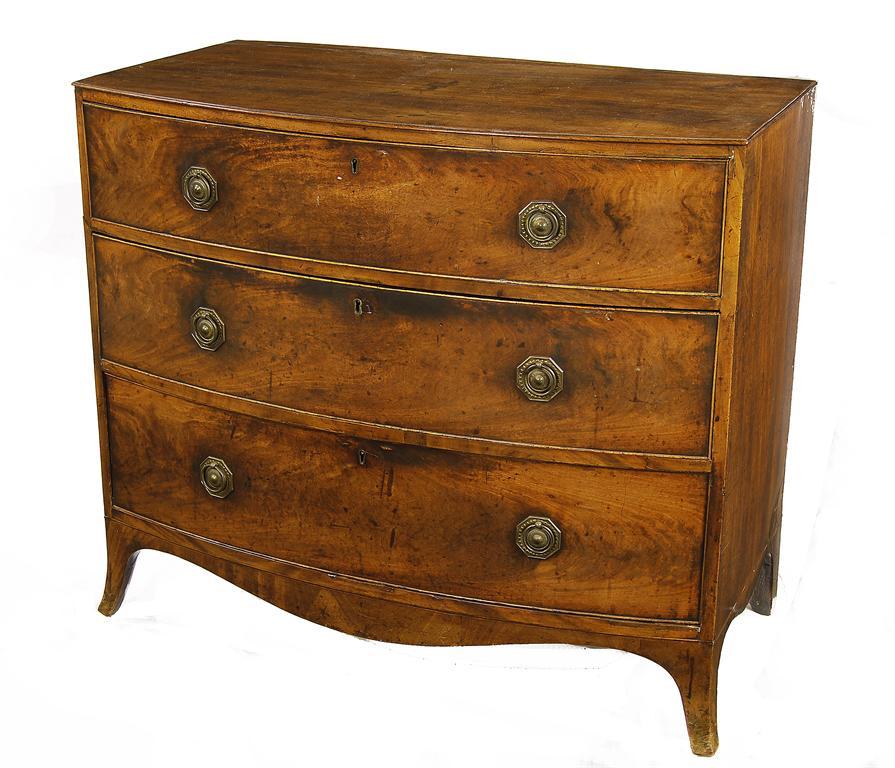 A Regency mahogany bowfront chest, the moulded edge top above three graduated oak lined drawers fitted replaced handles on swept bracket feet, 33.5in (85.2cm) h, 40in (101.5cm) w, 18.5in (47cm) d. Restoration.