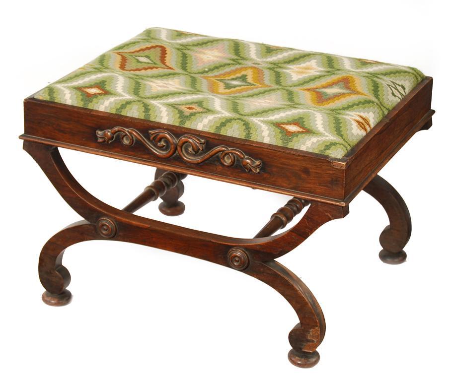A William IV rosewood 'X' frame stool, with applied carved foliate decoration, and twin stretchered supports, 16.5in (42cm) h, 24in (60.7cm) w, 20in (50.7cm) d. Losses to veneer and carved decoration.