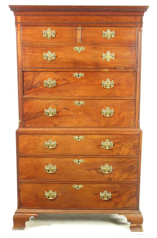 A mahogany chest on chest, the dentil cornice above a plain frieze and a later dummy cupboard door above two long drawers flanked by fluted canted angles, the base with three long drawers, all fitted replaced brass handles, on shaped ogee bracket feet, 18th century and adapted, 73in (185.2cm) h, 44.5in (112.5cm) w, 21.75in (55.3cm) d.