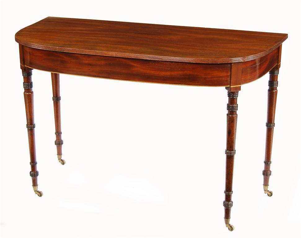 A mahogany side table, the associated 'D' shaped reeded edge top above a plain frieze on ring turned tapering legs to brass caps and castors, 28in (71cm) h, 42.5in (107.6cm) w, 20.25in (51.8cm) d.