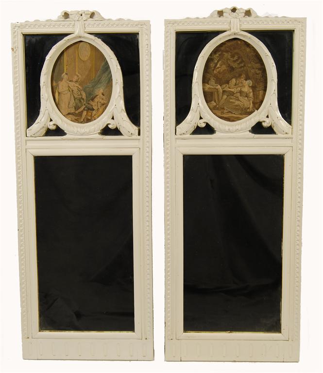 A pair of pier mirrors, each with a divided frame and a carved laurel wreath with an inset hand coloured engraving, a moulded edge and tied ribbon surmount, early 20th century, 40.5in (103cm) h, 15.75in (40cm) w. (2)