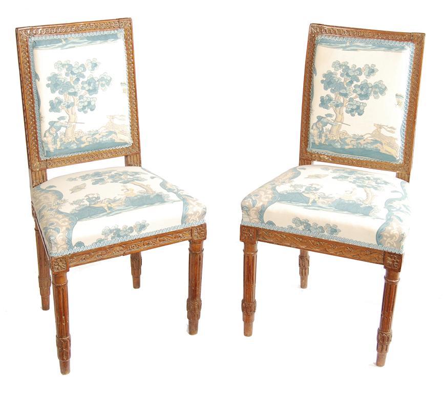 A pair of French carved beech wood side chairs, the rectangular later padded backs with a guilloche frame to a stuffed-over seat with Vitruvian scroll frieze on floret capped stop fluted tapering legs. (2) Old repairs.