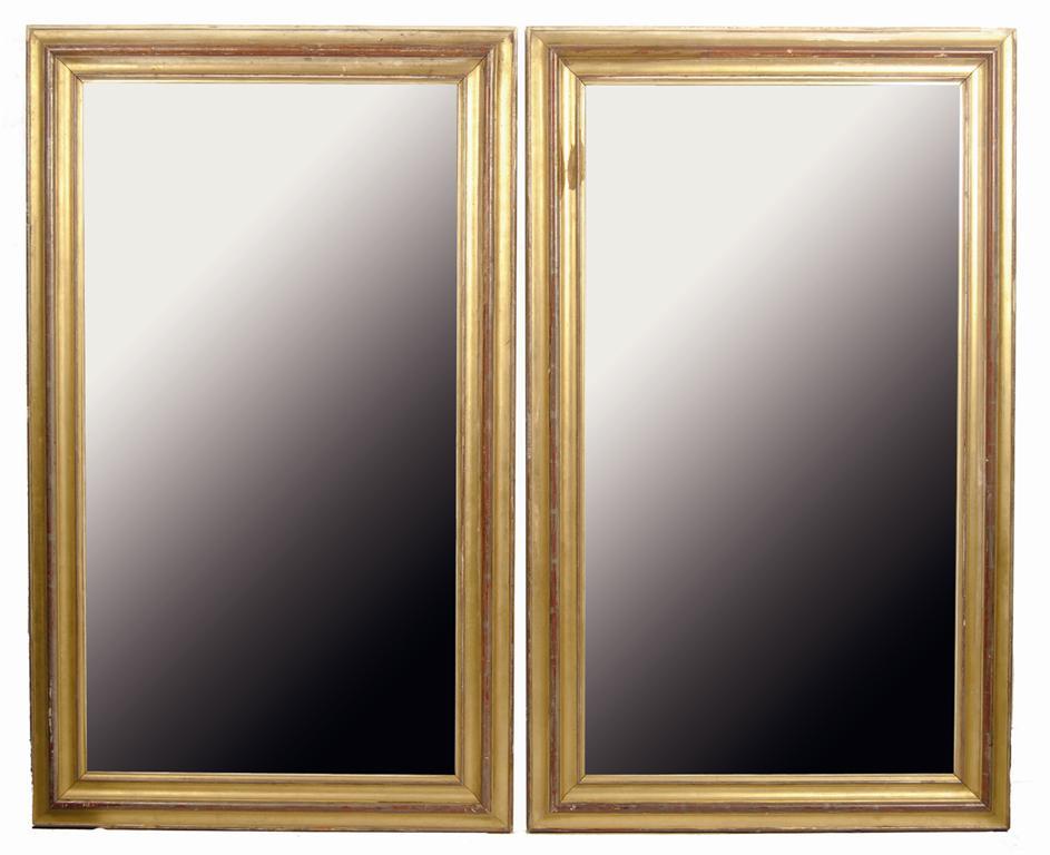 A pair of giltwood and gesso rectangular wall mirrors, with moulded frames, 54.5in (138.5cm) h, 33in (83.7cm) w. (2)