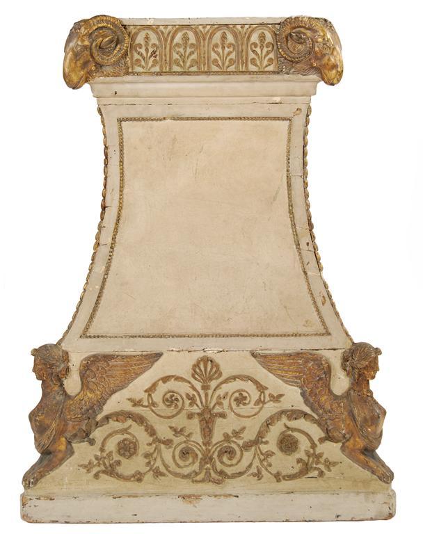 A pair of early 19th century giltwood and gesso painted pedestals, of triangular form, raised on shallow plinths with scrolling foliage panels and sphinx corners above waisted vacant panels with bead borders and husk piping, the rams head corners flanking an arcaded frieze of scrolling leaves and berries, 32in (81cm) h, 24in (61cm) w at the base, 17.75in (45cm) w at the top. (2) Country house condition.