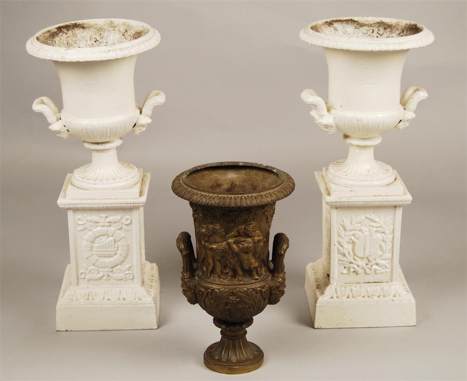 A pair of late 19th century French cast iron urns, later painted, of campana form on square plinths decorated musical and artistic trophies, 13.5in (34cm) h, and a brass vase decorated bacchanalian scenes. (3)